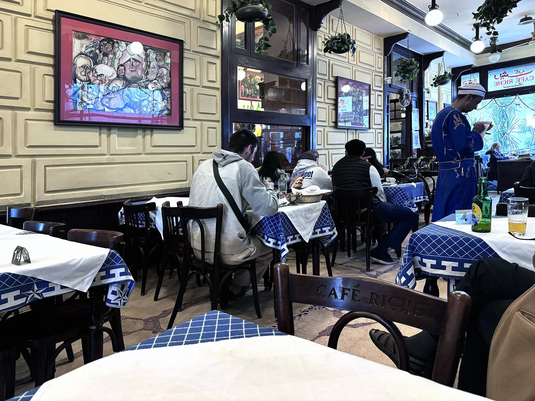 حينها كنتُ جائعًا جدًا. لم يخيب مطعم فلفلة ظني. الفول والطعمية يُقدمان في نفس الديكور الريفي الذي لم يتأثر بالموضة. إنه أحد المعالم القليلة التي نجت من التغييرات المستمرة التي طرأت على المدينة. بعد ذلك، توجهت سيرًا على الأقدام إلى مقهى ريش، الذي كان يومًا ما ملتقى للثوار والمثقفين والسياسيين. جلس نجيب محفوظ هنا، كما كان يرتاده ممثلون مثل يوسف وهبي وليلى مراد. تزين الصور الجدران، في مشهدٍ منتقى بعناية من الحنين إلى الماضي.طلبتُ مشروبًا محليًا وجلستُ أتأمل. لكن ريش لم تعد رمزًا للتمرد. باتت مقصدًا للسياح العرب والأوروبيين والمصريين من طبقة معينة. خارج الكافيتريا، كان الشباب يلتقطون صورًا شخصية بجانب النافذة. حلّت المظاهر محل السياسة. رأيت مجموعة من المراهقين يبدو انهم من منطقة شعبية يقفون بفضول امام المدخل، شعرتُ أنهم لن يُرحب بهم. أصبح الاندماج جماليًا لا اجتماعيًا