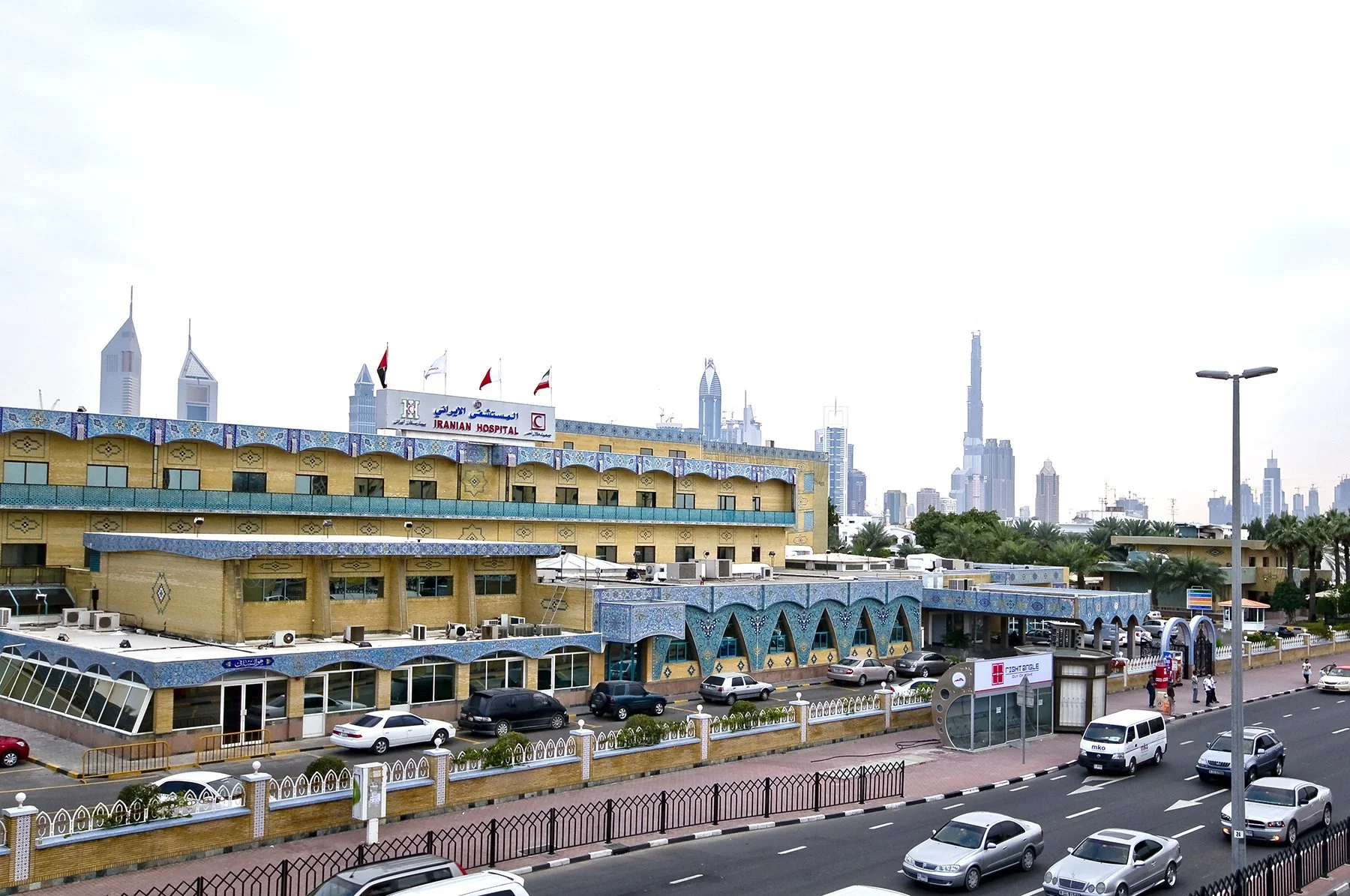 What drew me there, however, was not only its social role but its architecture. The complex stretched across several blocks, with an outpatient facility located on the opposite side of the road. The buildings were unlike anything else in Dubai. Their style was a hybrid—part Persian, part what its designers interpreted as Islamic—yet unmistakably rooted in a particular cultural sensibility. Decorative ceramic tiles adorned façades. Geometric motifs framed entrances. Arched openings and patterned surfaces softened the institutional character typical of hospitals. Passing through the complex, one had the distinct sensation of being transported elsewhere—into a Persian urban environment that felt authentic and lived-in, not staged or theatrical. This was not the simulated exoticism of themed retail environments. It was the opposite of the Persian Court at Ibn Battuta Mall, where cultural motifs are reduced to spectacle and consumption. The Iranian Hospital, by contrast, was real. It functioned. It served people. Its architecture was embedded in everyday life.