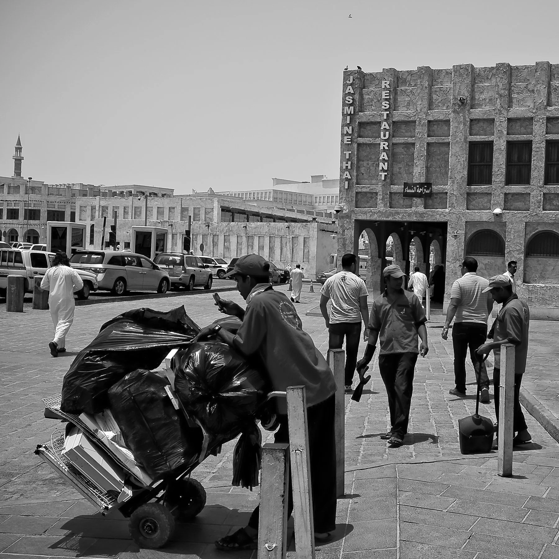 The second section turns to Souq Waqif, a reconstructed marketplace that has become a central site for negotiating heritage and identity in contemporary Doha. Carefully restored and curated, the souq evokes a stylized version of the past while functioning as an active public space animated by residents, visitors, and migrant communities. It represents a deliberate attempt to reclaim a sense of continuity, even as it raises questions about authenticity and the commodification of tradition. The final group of images captures West Bay, Doha’s modern skyline, where glass towers and monumental developments project an image of global ambition and economic power. Together, these three perspectives—Najada’s fragile remnants, Souq Waqif’s staged historicism, and West Bay’s spectacle—reflect the layered and often contested processes through which Doha has sought to define itself as a modern city.
