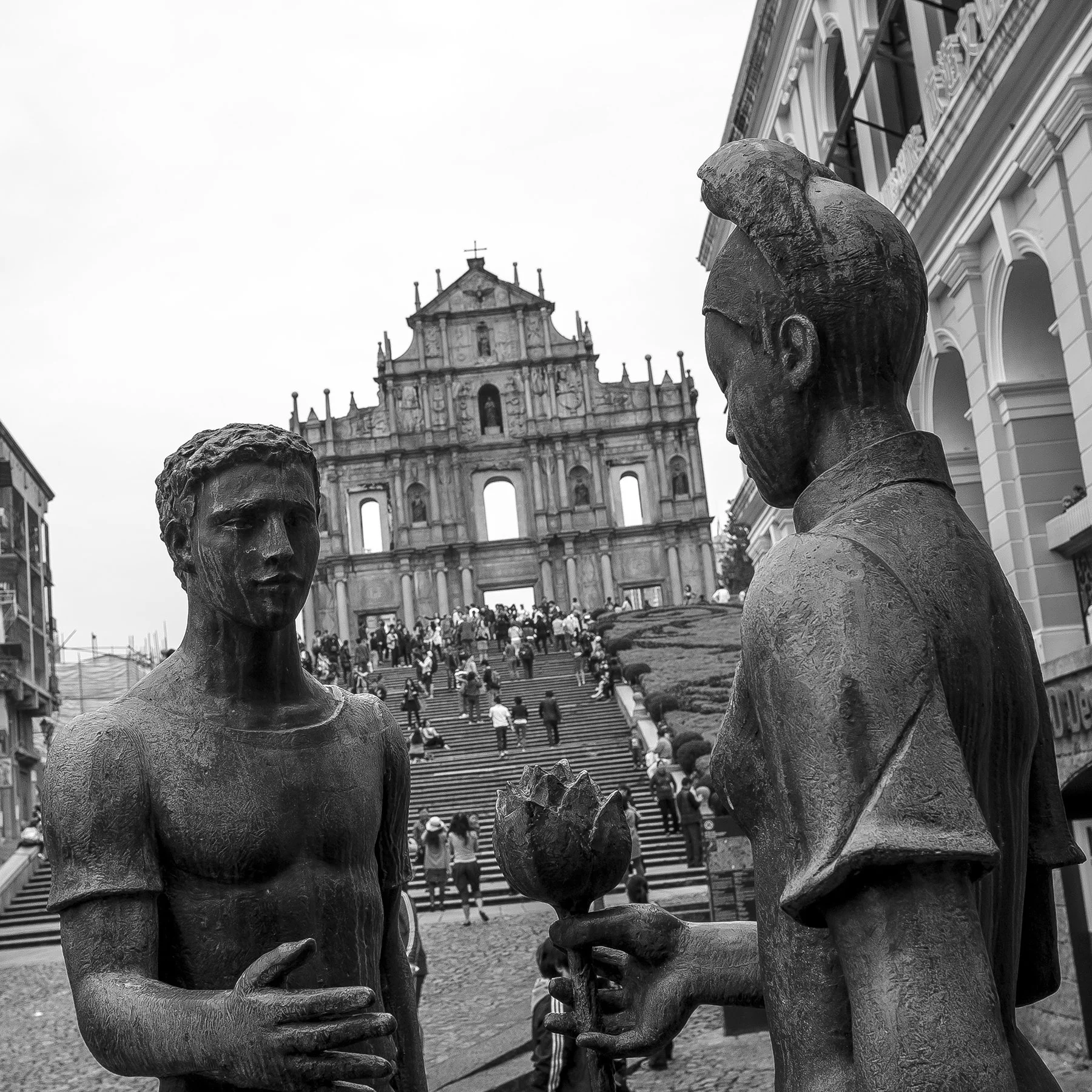 The Macau Series was photographed in 2013 using my trusted Fuji X100, capturing a city shaped by a distinctive fusion of Portuguese heritage and strong Chinese cultural inflection. Reached directly by boat from Hong Kong airport, Macau immediately reveals itself as a place of contrasts—between historic streets and hyper-spectacular developments, between colonial memory and contemporary consumption. The series moves through the historic downtown, where Portuguese pavement—calçada portuguesa—and ceramic tiling articulate streets lined with modest homes, outdoor eateries, and quiet corners of everyday life. In one side street, a bride poses for photographs, while nearby cafés such as Café de Nata offer the city’s famous egg pastries, reinforcing the lingering Lusophone presence within an unmistakably Chinese urban environment.