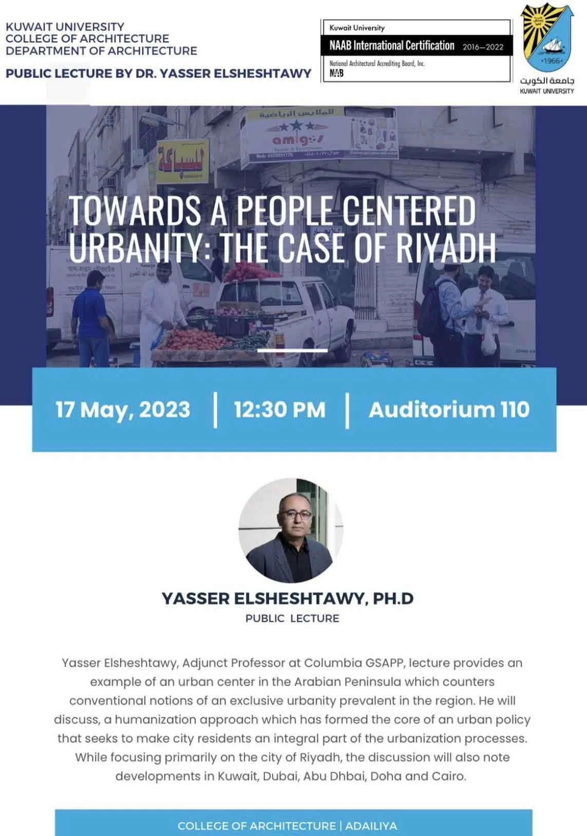 Public Lecture: Kuwait University. College of Architecture. Kuwait. “Towards a People Centered Urbanity: The case of Riyadh.” May, 2023.